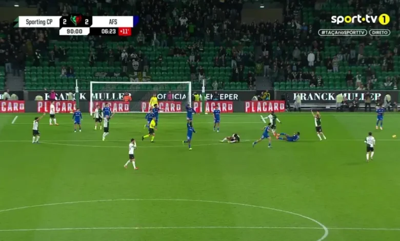 Minuto 90+6: Sporting ganha um livre perigoso após disputa de bola entre Luis Suárez e Baroan, que fica muito queixoso. Jogadores ficam em choque com o estado da perna do jogador do Aves SAD, que parece partida. Luís Suárez levou as mãos à cabeça e Maxi Araújo rezou.
